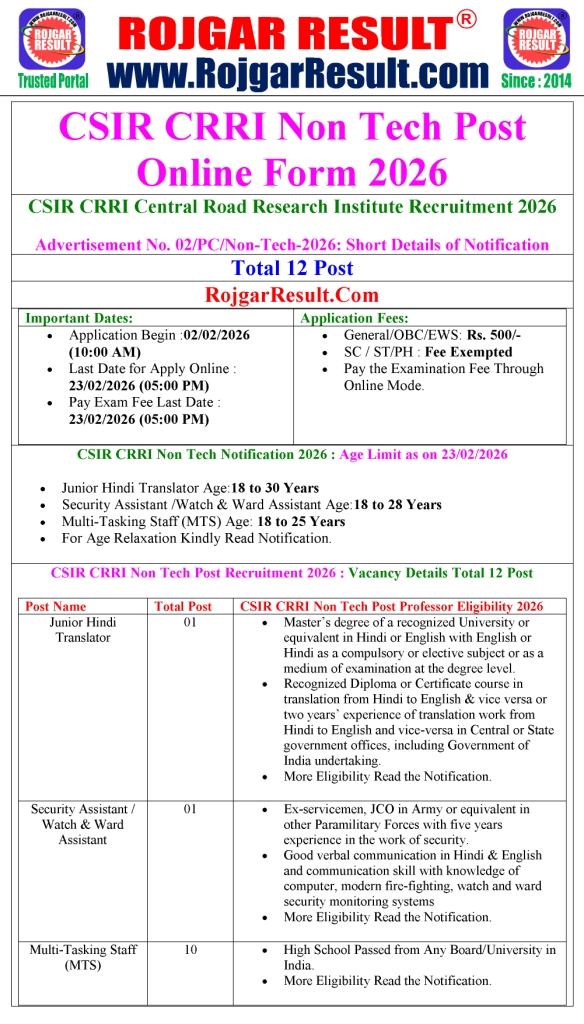 सीएसआईआर-केंद्रीय सड़क अनुसंधान संस्थान (CSIR-CRRI), नई दिल्ली ने गैर-तकनीकी (Non-Tech) पदों जैसे जूनियर हिंदी ट्रांसलेटर, सुरक्षा सहायक और मल्टी-टास्किंग स्टाफ (MTS) के लिए विज्ञापन संख्या 02/PC/Non-Tech-2026 जारी किया है। भारत सरकार के विज्ञान और प्रौद्योगिकी मंत्रालय के तहत यह एक प्रमुख अनुसंधान प्रयोगशाला है। जो उम्मीदवार इन पदों के लिए आवेदन करना चाहते हैं, वे 02 फरवरी 2026 से 23 फरवरी 2026 तक ऑनलाइन आवेदन कर सकते हैं। भर्ती से संबंधित पात्रता, आयु सीमा और आवेदन प्रक्रिया की पूरी जानकारी yojnanaukri.com पर नीचे दी गई है।
